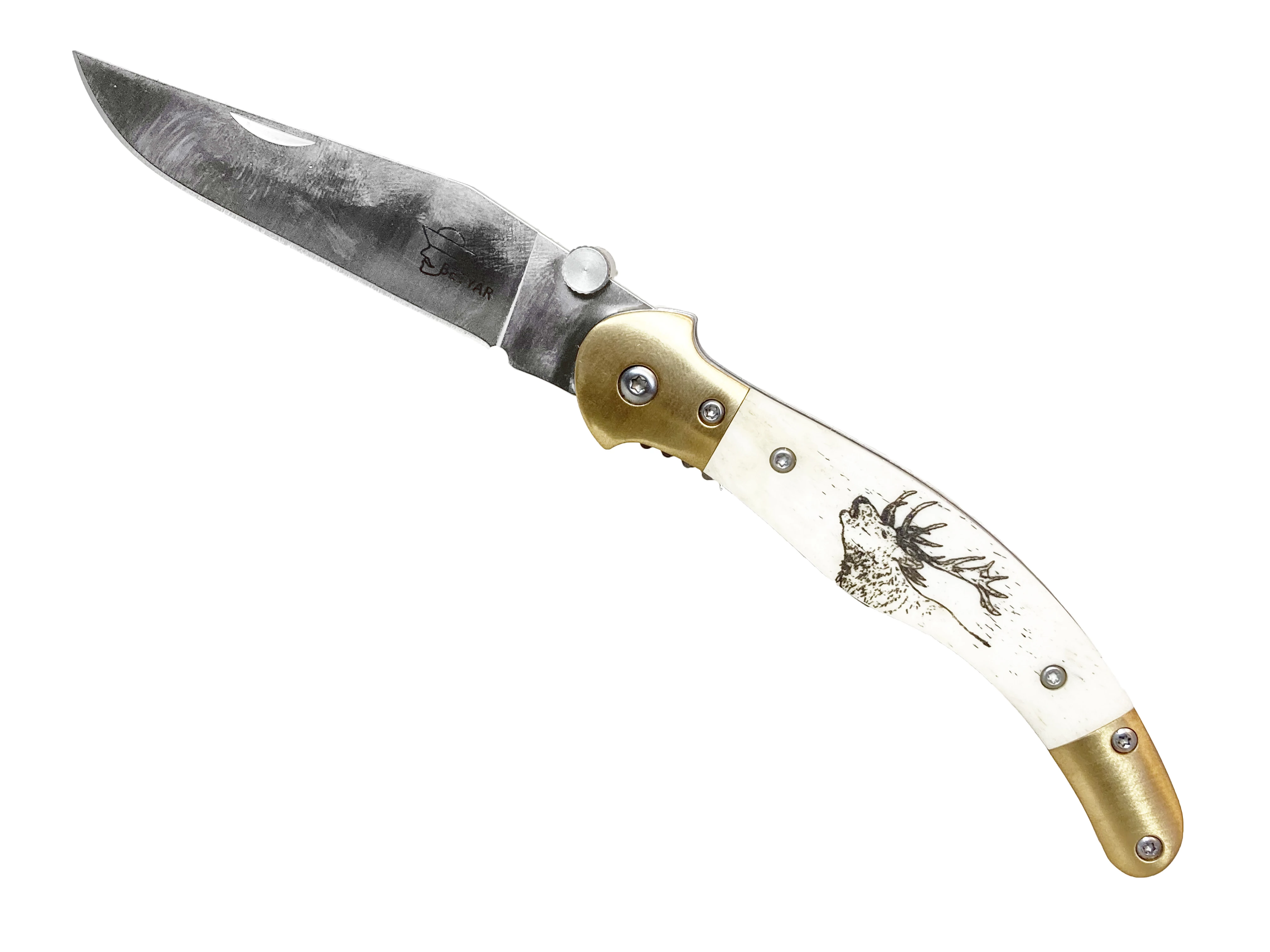 A Betyár Bicska egy hamisítatlan magyar gyártó, csak és kizárólag magyar késeket készítenek, nem csoda, hogy a legnépszerűbb, leginkább elterjedt Fejesgörbe kés is a repertoár részét képezi, hiszen ezzel a típussal teljesedik ki az igazán magyar kések felhozatala. A Betyár Bicska elképzelésében ez a bicska is csak minimális modernizáción esett át, épp csak annyira, hogy az ne érintse az autentikusságot, de továbbra is kényelmesen és biztonságosan lehessen használni. A Fejesgörbe így liner-lock nyitást kapott, mely a legelterjedtebb rendszer, több taktikai modellen is. A lényege, hogy a penge kinyitása után annak illesztését egy, a markolaton belül lévő lemez megakasztja és stabilan a helyén tartja, míg hüvelykujjunkkal azt befelé nem nyomjuk és visszahajtjuk. A penge S44002-es rozsdamentes acélból készült, alul kiszélesedő részére egy nyitáskönnyítő került. Markolatpaneljeinek csont részeit alul és felül is fém részek zárják, így tartós masszív darab. Markolatát gímszarvas motívum díszíti.