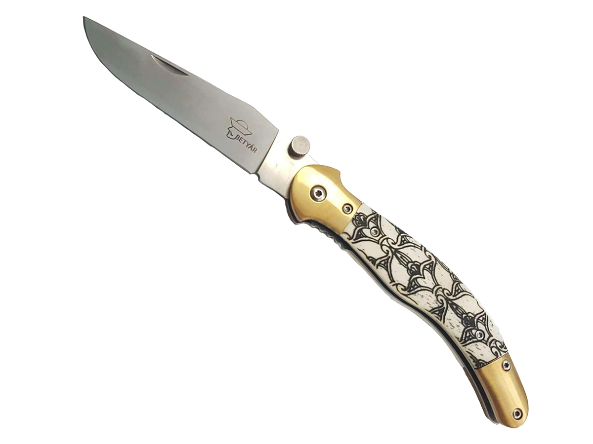 A Betyár Bicska egy hamisítatlan magyar gyártó, csak és kizárólag magyar késeket készítenek, nem csoda, hogy a legnépszerűbb, leginkább elterjedt Fejesgörbe kés is a repertoár részét képezi, hiszen ezzel a típussal teljesedik ki az igazán magyar kések felhozatala. A Betyár Bicska elképzelésében ez a bicska is csak minimális modernizáción esett át, épp csak annyira, hogy az ne érintse az autentikusságot, de továbbra is kényelmesen és biztonságosan lehessen használni. A Fejesgörbe így liner-lock nyitást kapott, mely a legelterjedtebb rendszer, több taktikai modellen is. A lényege, hogy a penge kinyitása után annak illesztését egy, a markolaton belül lévő lemez megakasztja és stabilan a helyén tartja, míg hüvelykujjunkkal azt befelé nem nyomjuk és visszahajtjuk. A penge S44002-es rozsdamentes acélból készült, alul kiszélesedő részére egy nyitáskönnyítő került. Markolatpaneljeinek csont részeit alul és felül is fém részek zárják, így tartós masszív darab. Markolatát népi motívum motívum díszíti.