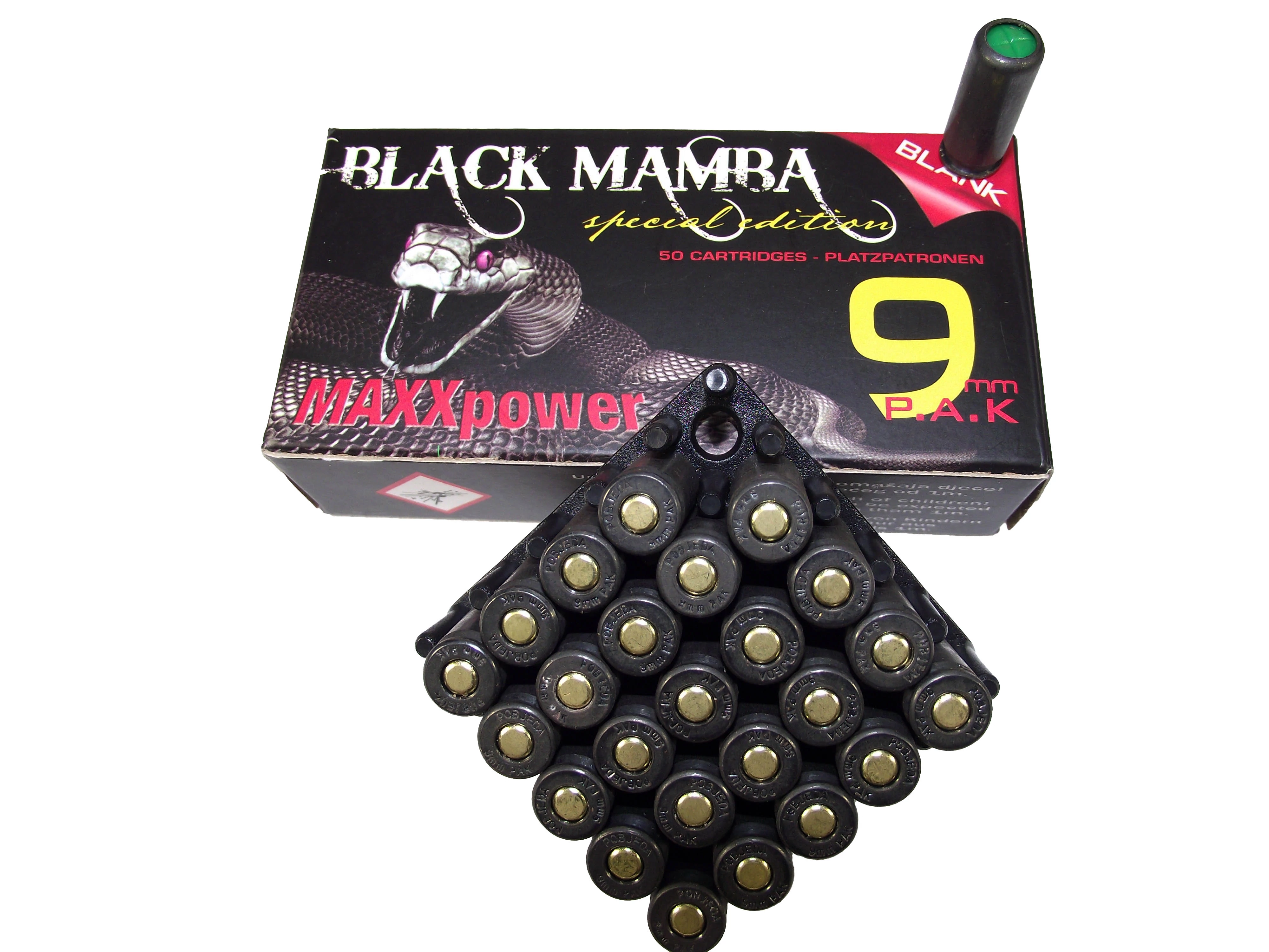 A Black Mamba az átlagos riasztópatronok lőportöltetének másfélszeresével rendelkezik, így meghatványozódik a hang és fényhatás is a használatával. Számos gáz-riasztó pisztoly visszatérő hüvelykivetési hibáját képes orvosolni, mivel nagyobb erővel löki hátra a szánt is. Minden pisztolyhoz ajánlott, szerkezeti károkat nem okoz.