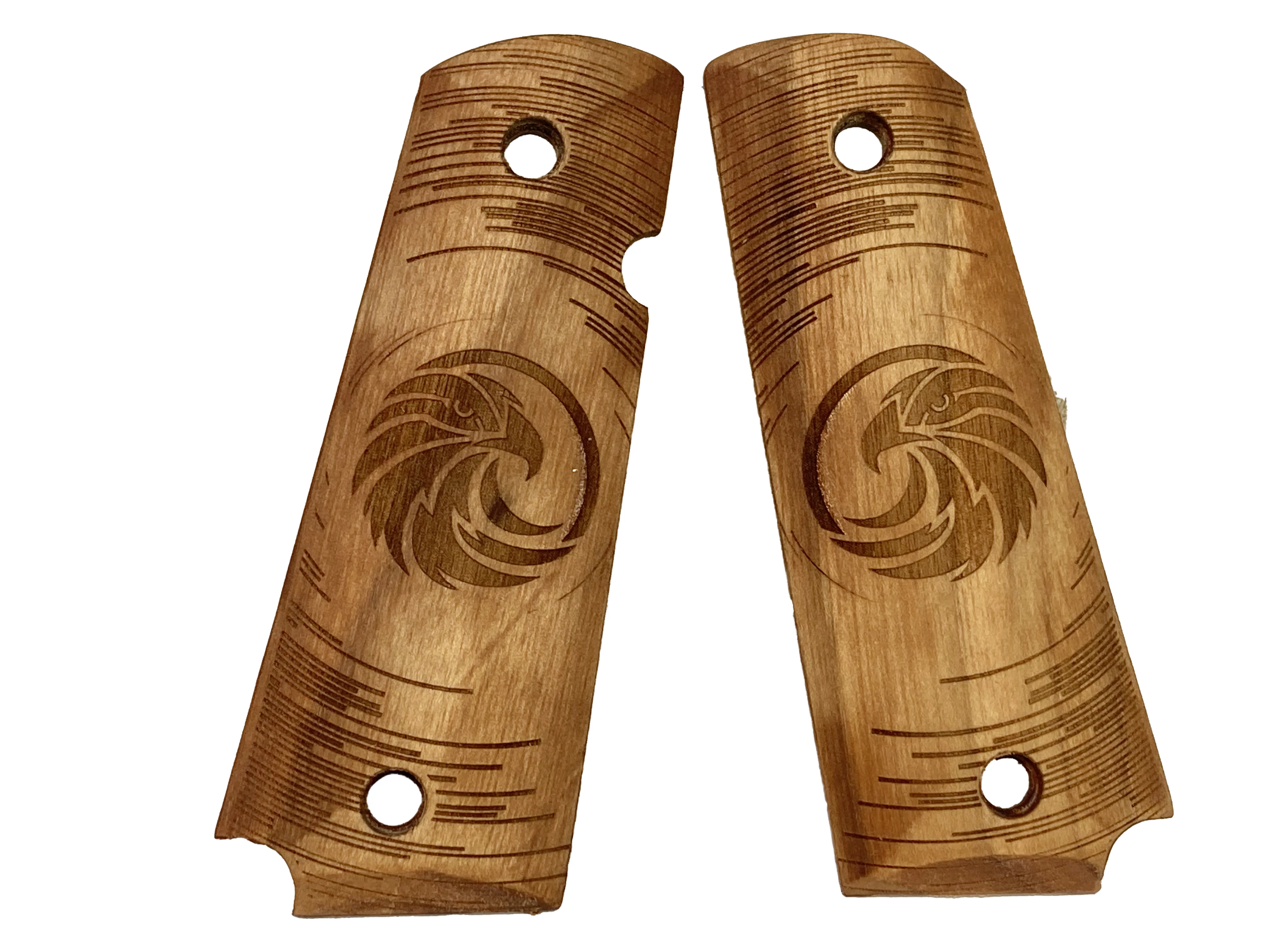 Törökországban készült, diófából faragott markolatpanel Colt 1911-es pisztolyokhoz. A markolatpanelek kidolgozása és felülete elképesztően igényes, nagyon feldobja az egyébként szintetikus markolattal rendelkező 1911-es típusok megjelenését. Ezen a markolaton sas látható.