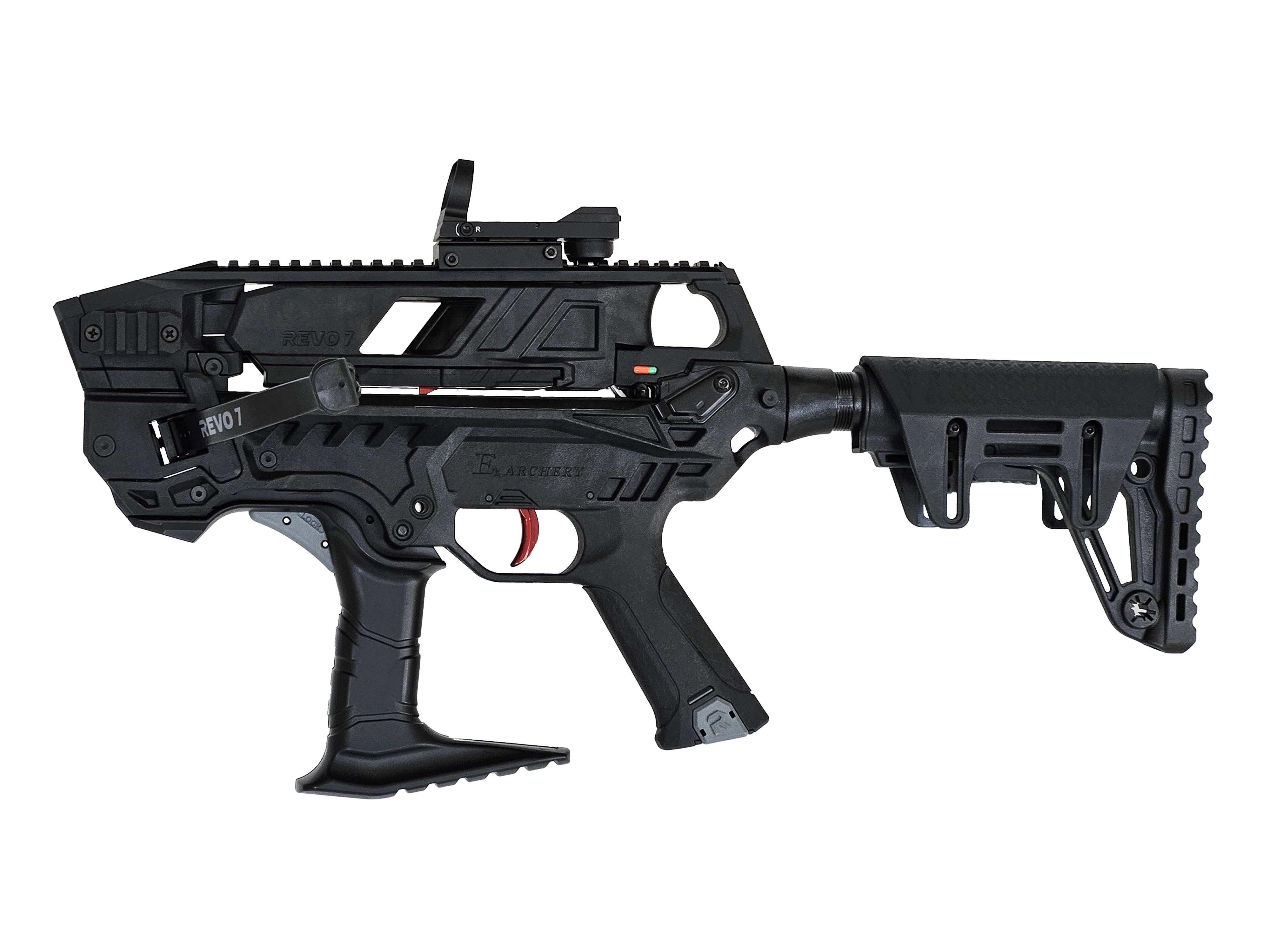 A Revo7-hez kifejlesztett karbon nyílvesszők 5,5 mm átmérőjű, rendkívül karcsú testtel rendelkeznek. Ez a kialakítás jelentősen javítja a repülési tulajdonságokat a hagyományos 6,3 mm-es nyilakhoz képest. A számszeríj fő alkotóelemei (váz, kar, Picatinny sín, tus, tár) szerszám nélkül, gyorsan szétszerelhetők, így könnyedén szállítható. Üres tár elleni védelem: A fegyver nem feszíthető, ha nincs benne nyíl. Kétoldalas biztosítókar: Megakadályozza a véletlen elsülést. Automatikusan vagy manuálisan is aktiválható, a kiválasztott üzemmódtól függően. Megfelelő gyakorlattal kb. 4 másodperc alatt 7 lövés leadható, és a fegyver minden lövés után villámgyorsan ismét tüzelésre kész. A REVO7 a haladó felhasználók és taktikai eszközöket keresők számára készült. Precíz kivitelezése, fejlett biztonsági megoldásai és nagy teljesítménye révén kiváló választás cél- és taktikai lövészethez.