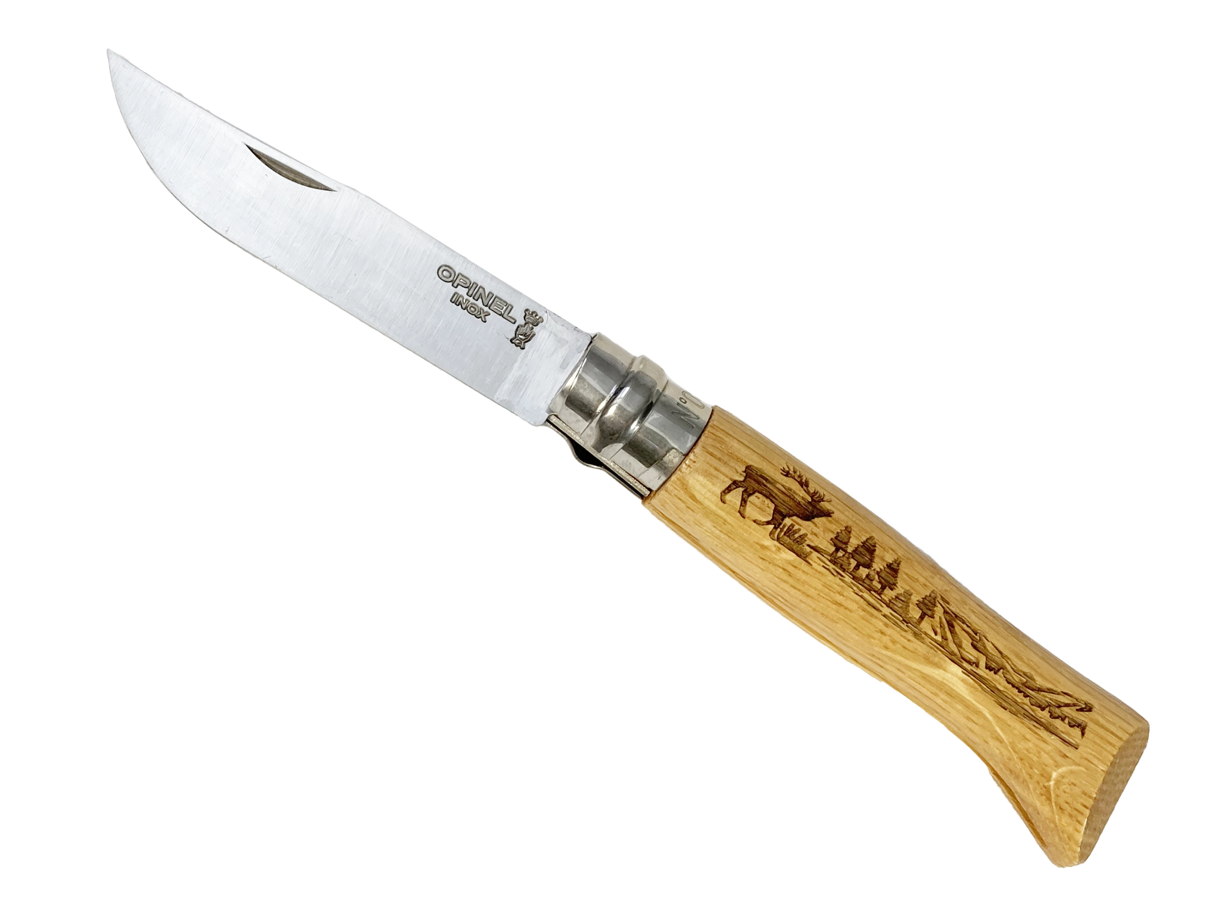 Az Opinel No.8 Colorama egy hagyományos kézműves bicska, ami kulcstartó méretekkel, és minőségi lakkozott fa markolattal rendelkezik. Pengéje 85 mm hosszú, Sandvik 12C27-es rozsdamentes acélból készült. Fa markolatát szarvas minta díszíti.