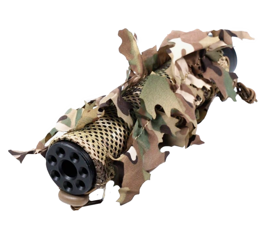 Ez a 3D álca kifejezetten a nagyobb, mesterlövész puskákon használatos hangtompítókra készült. Külső borítása multicam levelekkel lett borítva, így nem csak a színt, de a formát is álcázza.